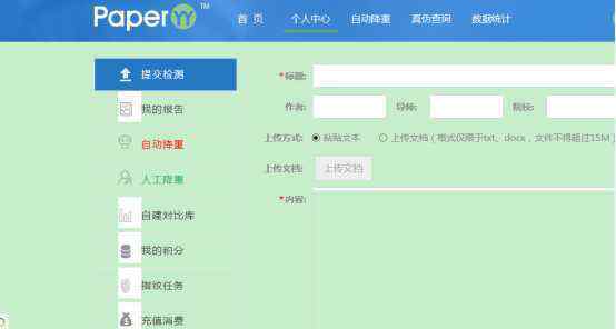 Paperyy注册登录后,所有功能操作都出现在左侧。我们可以看到它有提交测试、我的报告、自动减肥、手动减肥、自建对比库、我的积分等功能。对于提交测试,用户也有两种选择:上传文档和复制粘贴。在我看来,一整个页面的体验并不是特别好,视觉效果也不如前两个。