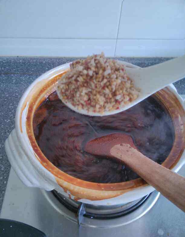 8 熬到膏体较浓稠时,放入研碎的核桃,花生,芝麻