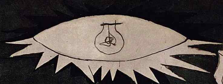 第一部分是天花板上的灯泡。至于这个灯泡多少瓦,无所谓。重要的是天花板上唯一的灯泡照亮了充满夜晚的恐怖房间。这个灯泡的特点是它的光晕呈锯齿状,显示出发光的强度。可以看出,这个灯泡不仅是一个灯泡,而且是燃烧弹或投到格尔尼卡的炸弹的象征。此外,这个灯泡看起来像一只眼睛,所以在黑暗中观看的人,当然是无所不知、无所不能的上帝。毕加索通过这个灯泡告诉法西斯,你等着,看你过得怎么样,人们在看,上帝的老人能看到你造成的暴行。同样,痛苦的人也不应该恐慌绝望。上帝会主持正义。