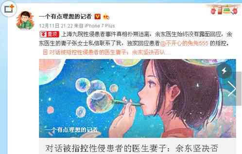 11日,余东医生的妻子张女士表示,余东坚决否认与患者发生过性关系,患者曾多次在医院闹事,并砸医院电脑,要求赔偿10万元。并公开自己和图图的聊天记录。