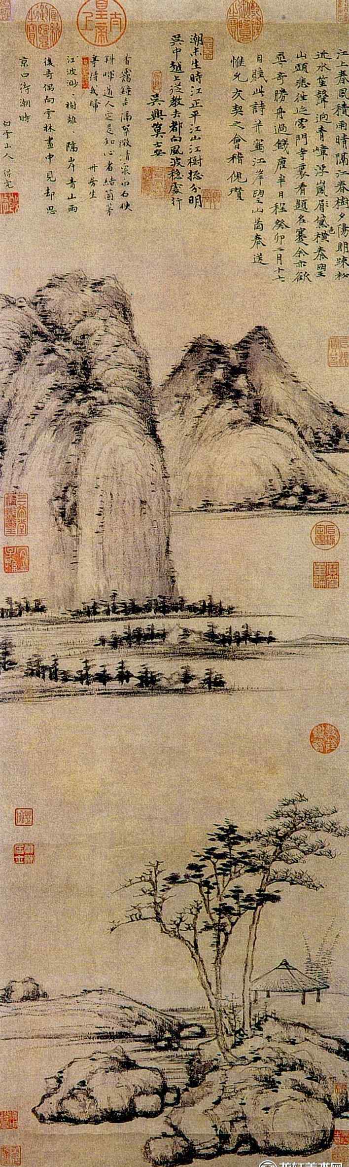 此图采用倪瓒首创的“一江两岸”构图。即近坡、中水、远丘三级结构模式。虽然看河岸山的画面还是由一条河的两岸组成,但是画在河对面的不是一座低矮的小山,而是一座两端突兀的山。山脚下的沙洲上有一排排丛生的树木。这与画家常用的平原景观布局不同。画家用干笔色画山石,画成马的样子,用笔把中心改成侧身正面,用折叠带画山石,干笔干墨,意境淡雅散漫,荒凉冷峻空风格超脱。在图中,一首名为《七律》的诗解释了这部作品的创作原因。这首诗和这幅画都是倪瓒送朋友去惠济时写的。根据图画,是郑智二十三年,即公元1363年,作者63岁。