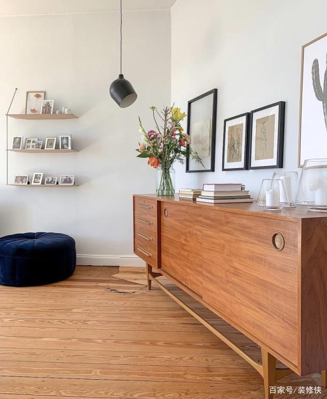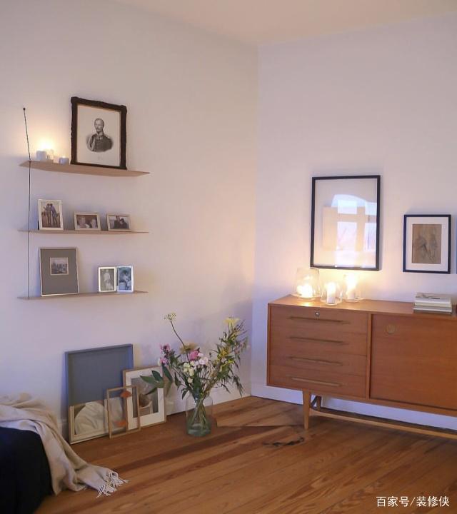 一种利用了墙壁的空间,设置了两个原木的隔板,在上面摆放了自己喜欢的照片,而且为了填补空白的墙面,还挂上了的壁画,时尚感十足。