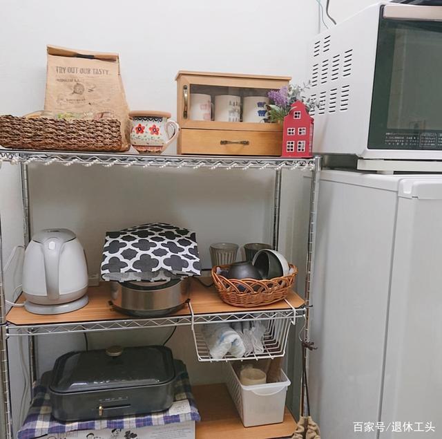利用了所有有效的空间,在靠墙的位置摆放了收纳架,上面摆放着各种厨具,因为这是可以组装的架子,你想摆放在哪里都可以,简直是独居的必备神器,就连女孩子都能轻松的拼接上。