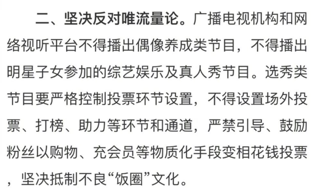 “要求平台不得偶像类养成节目,不得播出明星子女参加的综艺娱乐及真人秀,选秀类要严格控制投票环节,不得设置场外投票、打榜、助力。