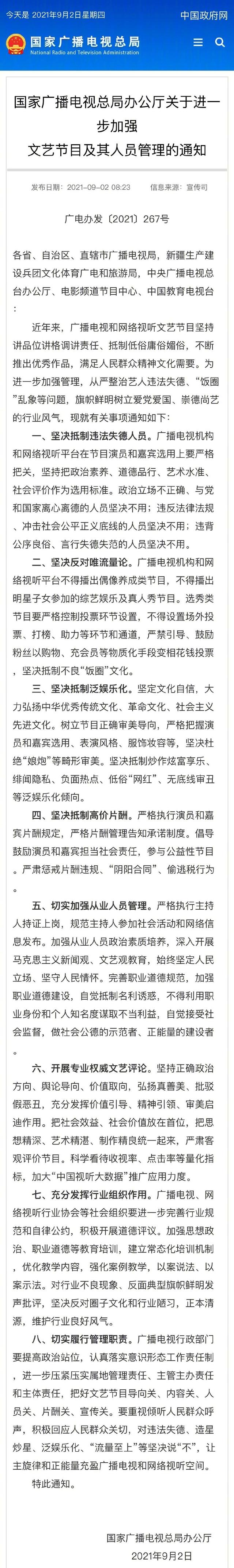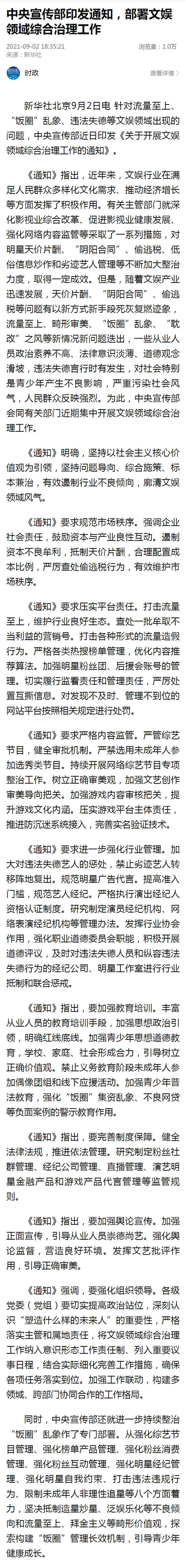后来,中演协会也发布了对于演艺人员经纪机构自律管理的公告,也让娱乐圈的标准越来越严了,而且,到了晚上,官媒也发布了对于文娱领域的综合治理通知,当中,明确点名了耽改剧的内容以及禁止义务教育阶段的未成年人参加偶像团体活动和线下应援,还有所谓的饭圈文化也进行了整治,足以看得出这次的打击力度之大。