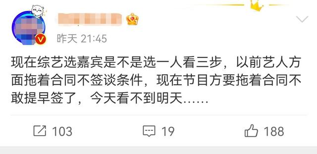 不仅如此,还有博主透露爆料随着娱乐圈的整顿加大力度,艺人跟节目组方面也发生了很大的转变,在过去,参加综艺节目的时候,基本上都是艺人方面拖着合同不签,直到谈出一个令自己满意的条件,现在,反而是节目组不敢随便签约,毕竟怕用了劣迹艺人直接导致整个节目都要扑街,而且,现在也不再是主动邀约艺人,反而是艺人方面主动联系节目组。