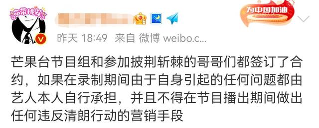 因为有了钱枫事件的前车之鉴,在广电新规颁布后,据知名娱乐博主爆料,直接让现在旗下最热门的综艺《披荆斩棘的哥哥》中所有的常驻嘉宾重新签合约,毕竟人数之多,而且还有很多港台的艺人,最主要的内容就是指在节目录制期间,由于自身所引发的问题全部要由艺人自己承担,并且要求在节目播出期间不得违反现在颁布的全新规定,看来也害怕他们会在社交平台上乱说话。