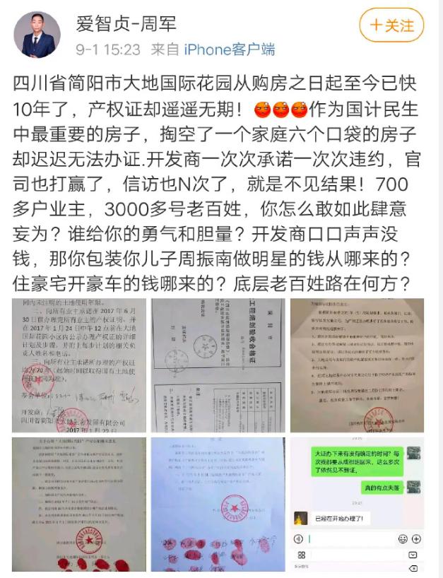 我们可以看到,周震南父亲的事情被爆出后,他很长一段时间都没出现在观众视野中,直到热度逐渐减退,他才开始接商业活动,当大部分网友以为这件事情会过去时,一件意想不到的事情又发生了,又有业主开始在网上维权,对方表示从购房之日起至今已快10年了,房产证却遥遥无期,开发商一次次承诺一次次违约,官司也打赢了,信访也N次了,就是不见结果。