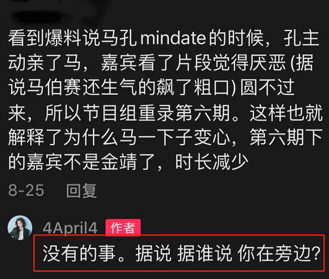 针对网友的疑问,以及有没有跟马董“越界”,小孔首次作出回应。她的态度很强硬,表示是没有的事,还质问对方你看见了,还是当时你在旁边?
