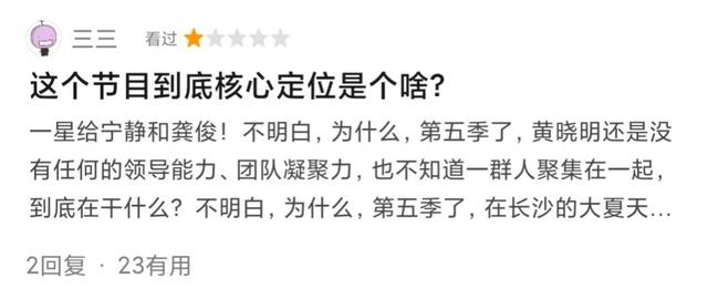 综合来说,这季的阵容搭配,十分不合格。掺杂了太多新人,且气氛沉闷。哪怕黄晓明、宁静的人设鲜明,也带不起气氛。