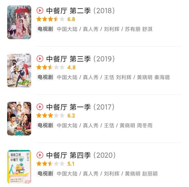 截至目前,《中餐厅》系列共五季节目,第五季是评分最低的一季。且在第二季后,《中餐厅》就一直在不断下滑。