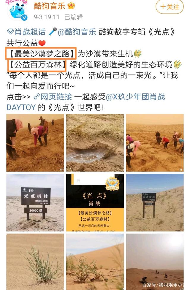 肖战为作品全力以赴的同时,也在不间断地支持着公益事业的发展:酷狗数字专辑《光点》公益行,种植树木,为沙漠带来生机。肖战粉丝小飞侠“大连公益团队”多次开展线下公益活动,关注孤独症儿童,并为他们带去了礼物,用爱意传递温暖,让孩子们能够在简单纯粹的世界里,向阳而生!正能量偶像肖战用自己的实际行动,帮助了许多面临困境的粉丝度过困难,这样的良性循环,也默默培养了粉丝的爱心,从而更加关注和爱护自己身边的人。