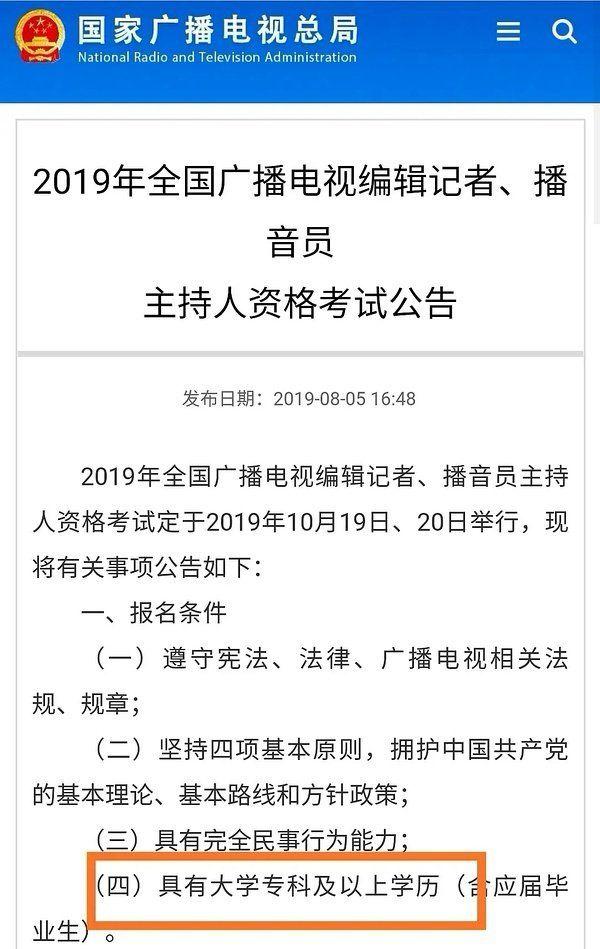 那么王一博的离开则成了注定,因为他没人主持人证。很多人都觉得没有就去考一个不就行了,然而根据相关规定,考主持人证书的前提条件需要本科学历,王一博的学历却仅仅只有高中而已,完全不符合考取主持人证的前提条件。