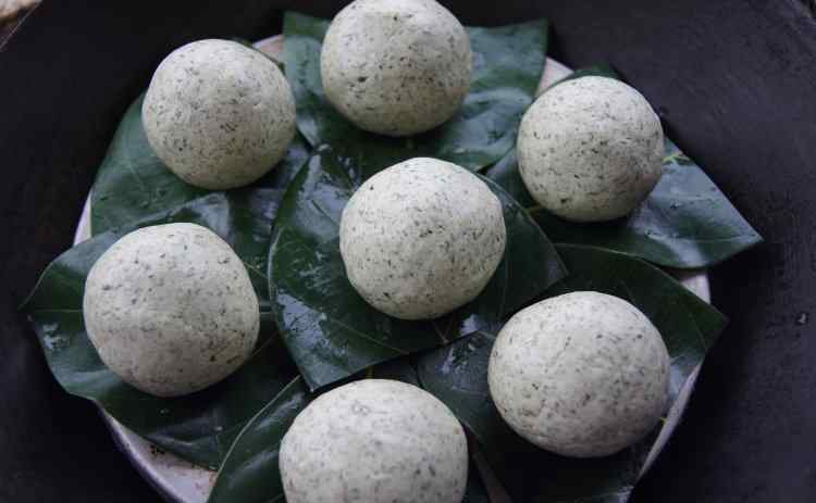 9 事先取几片木菠萝的叶子,清水洗净后用热水烫煮,沥干水,放凉。蒸笼上锅,用剪刀剪下合适大小的木菠萝的叶片,将其光滑面铺在蒸笼上面,然后放上包好的艾糍,最后盖上盖子,大火蒸15分钟即可。