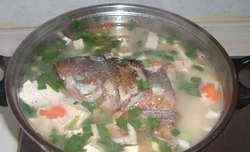 8 煮鱼的同时,切本站腐块,倒入鱼汤中,与鱼块同煮,保证让豆腐更入味。