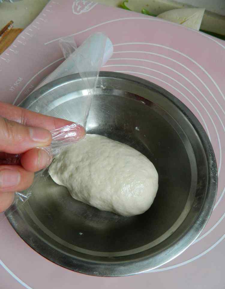 3 在面团上面莫有一层薄薄的花生油,包上保鲜膜醒制30分钟。