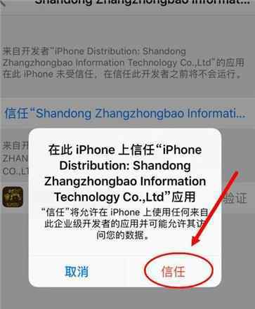 iPhone弹出来会话对话框,询问你是不是信任感该文件,挑选“信任感”。
