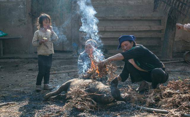 彝族人喜欢用火烧猪毛。