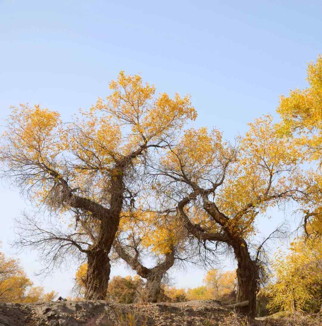 胡杨树被称作大漠英雄,有“上千年死不了,死而上千年屹立不倒,倒而上千年不朽”的叫法。