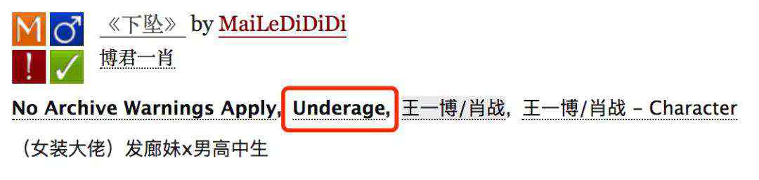 在上周,一篇名为《 下坠 》的同人文发在了 AO3 和另一个平台 LOFTER 上,这部作品描述的是两位男主角 —— 有性别认知障碍的 “ 肖战 ” 和一位高中生 “ 王一博 ” 之间相爱的故事。因为一些情节描写的关系,作者把它标注为 “ 未成年 ” 。