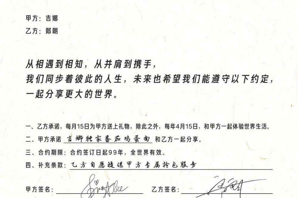 4. 补充条款:郎朗自愿提供吉娜专属拎包服务。最后,甲乙双方签名,合约生效。
