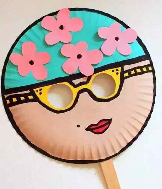 一种夏天乘凉用的小风扇,用纸盘和冰棒棍做成。用空两个圆当眼睛。在帽子上,剪一些小花。它们粘在一起很漂亮。孩子还可以剪小熊猫、兔子等可爱的图案。
