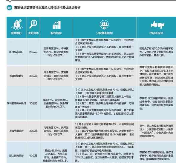 首批获批建设的五家民营银行,有两个以上的主发起人(指持股比例不低于10%的股东,下同)。主要发起人的股权结构及优劣分析见表1。