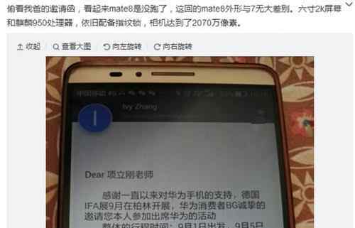 最新发展,9月2日有用户在微博上曝光华为新品邀请函,新品确定为Mate8。并表示Mate8搭载6寸2K屏幕,麒麟950处理器和指纹锁,摄像头使用2070万像素。
