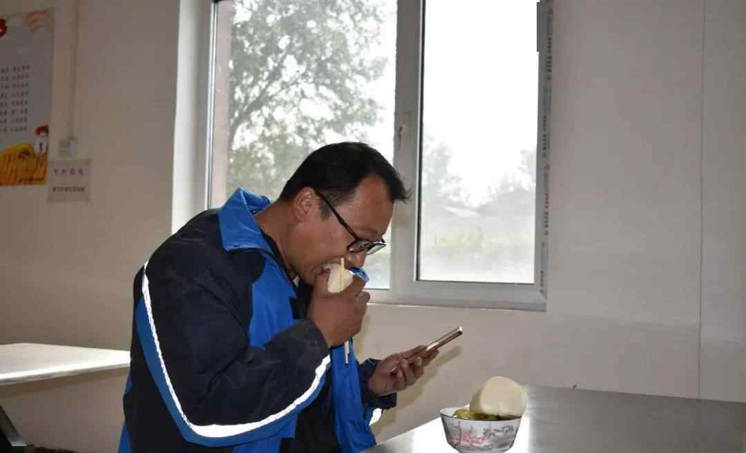 河北苍衡转运中心机器维修组组长周伟利正在吃午饭