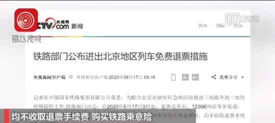 据中国全路集团有限公司消息,为配合北京疫情防控工作,在应急响应中已由三级提升至二级,铁路部门决定,从2020年6月17日00时起,旅客在2020年6月16日24时前申请办理北京出入境列车有效车票退票时,不收取退票费,并同时申请购买铁路意外险。