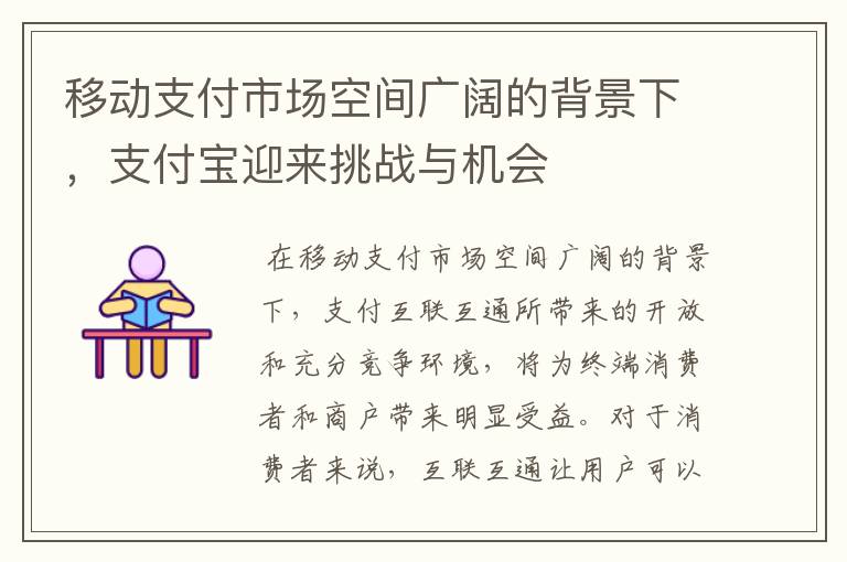 在移动支付市场空间广阔的背景下,支付互联互通所带来的开放和充分竞争环境,将为终端消费者和商户带来明显受益。对于消费者来说,互联互通让用户可以自主选择支付方式,...